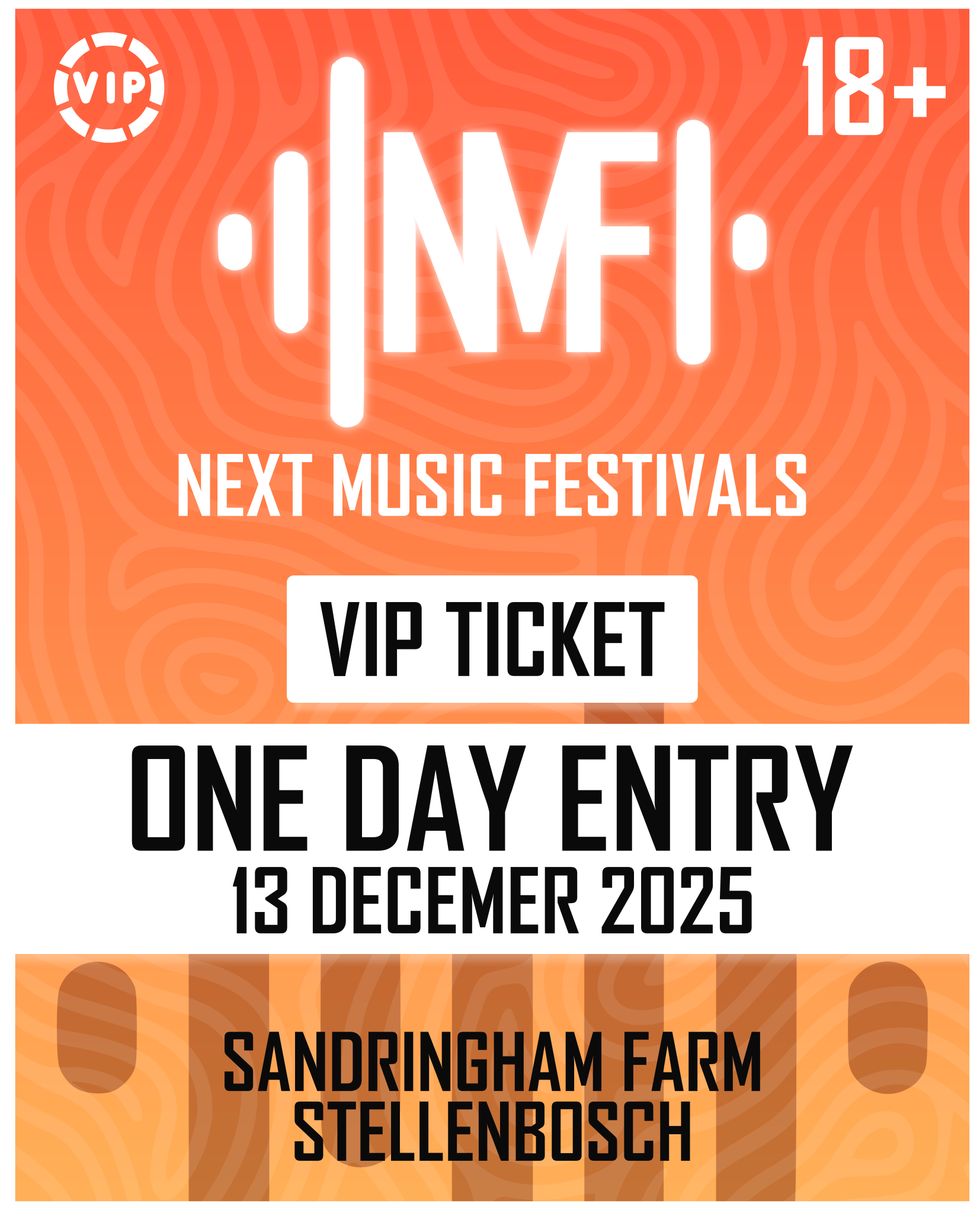 Enjoy NEXT DJ FEST in VIP. This ticket grants one-day VIP access to the event on 13 December 2025 at Sandringham, Stellenbosch, with entry to the dedicated VIP bar area and priority access at the front of the stage.